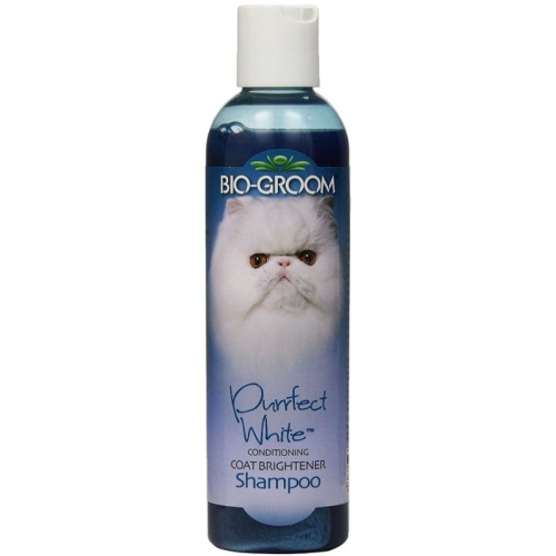 Bio Groom Purrfect White Cat Shampoo is a tearless coat brightening shampoo especially formulated to highlight white and other light colored coats.