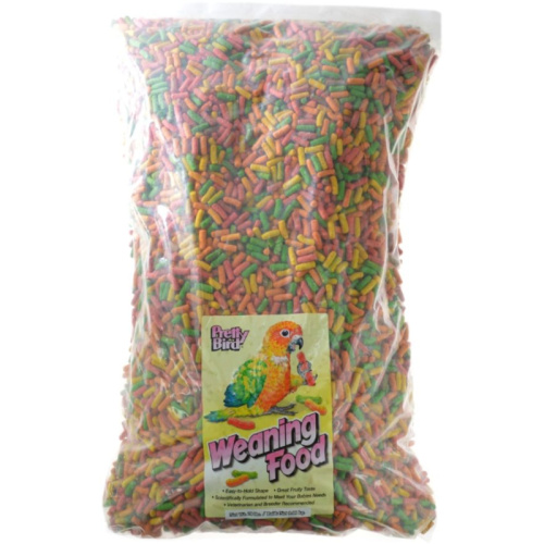 Pretty Pets Weaning Food has the same nutrition as the breeder formula but is extruded in a corn-curl shape that is easier for young birds to hold while they are learning to eat. Weaning food can be fed dry or moistened.
